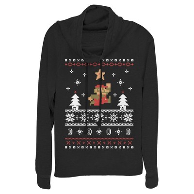 Get in the holiday mood with this Nintendo Mario Christmas Sweater Juniors' Cowl Neck! Pop open an issue of Nintendo Power, enter that cheat code, enjoy infinite lives, grab a mug of cocoa, and look great doing it!