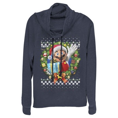 Now gamers can get in the holiday spirit with the Nintendo Ugly Christmas Sweater Mario Juniors' Cowl Neck! Mario, red and green mushrooms, super stars, and piranha plants create a holiday sweater-style print on the front of this festive Nintendo cowl neck.