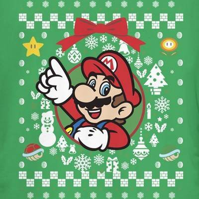 Now gamers can get in the holiday spirit with the Nintendo Mario Wreath Ugly Christmas Sweater Juniors' Tee! Shop festive holiday graphic apparel featuring Mario, Donkey Kong, Link, Zelda, and all your favorite Nintendo characters.
