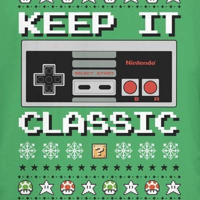 Now gamers can get in the holiday spirit with the Nintendo Ugly Christmas Sweater NES Classic Controller Juniors' Tee! Shop festive holiday graphic apparel featuring Mario, Donkey Kong, Link, Zelda, and all your favorite Nintendo characters.