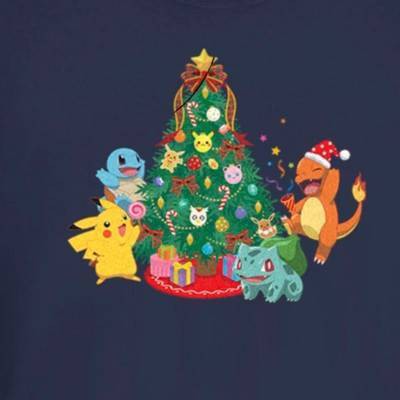 • Strut your stuff with this stylish new Christmas Juniors' T-Shirt that is perfect for the holidays! Featuring Pikachu, Squirtle, Charmander, and Bulbasaur celebrating around a Christmas tree decorated with candy canes, bows, festive lights, and Pokemon-shaped ornaments, including Jigglypuff, Delibird, and Eevee.