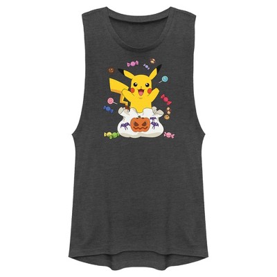 - Strut your stuff with this stylish new Halloween juniors' festival muscle tank top that is perfect for trick or treating! Featuring the adorable Pikachu coming out of a candy bag with a jack-o'-lantern and Zubats.