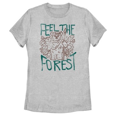 Strut your stuff with this stylish new Earth Day juniors' t-shirt that is perfect for heading out into the wilderness! Featuring a hand-drawn Ewok and the phrase: "Feel the forest," across the front.