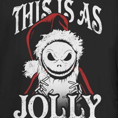 • Strut your stuff with this stylish new Christmas Juniors' T-Shirt that is perfect for the holidays! Featuring Jack Skellington dressed up for Christmas as Santa surrounded by the text "This Is As Jolly as I Get" printed in a distressed style.