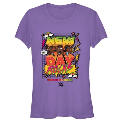 Strut your stuff with this stylish new juniors' t-shirt that is perfect for every occasion! Featuring a cartoon comic version of The New Day wrestling trio riding a unicorn with a rainbow in the background.