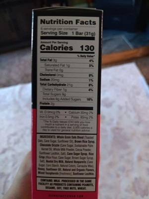 whole grain oats blend (toasted oats, cane sugar, sunflower oil), brown rice syrup, chocolate drizzle (cane sugar, sustainable palm kernel oil, whole milk powder, cocoa powder, sunflower lecithin, salt), cane sugar syrup, rice crisp (rice flour, cane sugar, brown sugar syrup, salt), nonfat dry milk, natural nonpareils (cane sugar, corn starch, natural colors, carnauba wax), honey, sunflower oil, natural and organic flavors, mixed tocopherols [freshness], sunflower lecithin' '