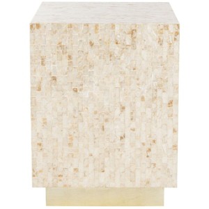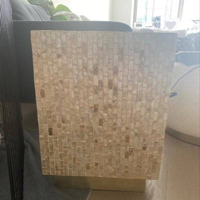 A solid design investment, this contemporary rectangle mosaic side table brings modern style to the living room. Soft shades of beige and gold highlight the depth and dimensionality of its lacquered faux mother of pearl for a touch of timeless luxury.