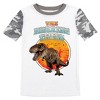 Roar into style with this boy’s 2-pack Jurassic Park pajama set. The set features a white short sleeve tee with gray camo sleeves and an image of a t-rex in front of a sun, paired with matching gray camo sleep pajama pants for a coordinated look. Made with cotton and polyester, this set provides comfort and durability. Machine wash it on cold with like colors and tumble dry on low heat for hassle-free care.