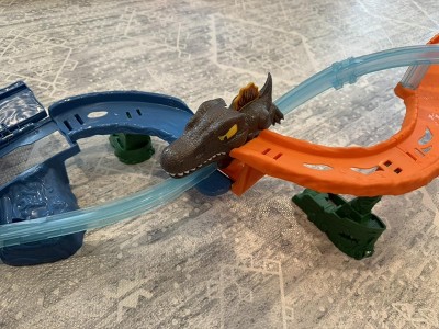 [This review was collected as part of a promotion.] This track set is a standout addition to any young racer's collection. It offers a great mix of excitement, interactive play, and smart design features that keep kids entertained for extended periods. One of the most thrilling aspects is the chomping dinosaur, which adds an element of surprise as it tries to snatch up cars mid-race. There's also a fun drop-out panel that can suddenly send cars down into a trap, adding variety and encouraging kids to race again and again to see what happens. The track includes built-in storage for three cars, which is incredibly helpful for keeping everything organized when playtime is over. Even better, the entire set folds neatly in half and clicks securely, making it easy to store or transport without worrying about loose pieces. It’s also compatible with other tracks, allowing for creative expansions and even more imaginative racing scenarios. While the set has a lot going for it, there are a few areas that could use improvement. The dinosaur’s mouth is just barely large enough to chomp the included car, which can be a bit disappointing if you're hoping to use larger or varied vehicles. The ramp adjustment feature, which controls the height and speed of launches, requires multiple button presses to move between levels—one slow click at a time—which can feel a little clunky during play. Additionally, while the race starts off fast and exciting, cars tend to slow down by the end of the track which can make the finish less exciting and requires significant ramp creation to extend the track line. Overall, this track is a fun, imaginative, and well-designed toy that offers great value, especially for dinosaur-loving racers. Despite a few minor design quirks, the sturdy build, compact storage, and entertaining features make it a highly enjoyable set for both solo and group play.