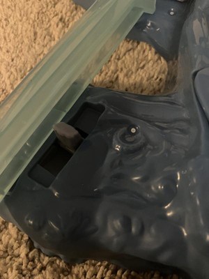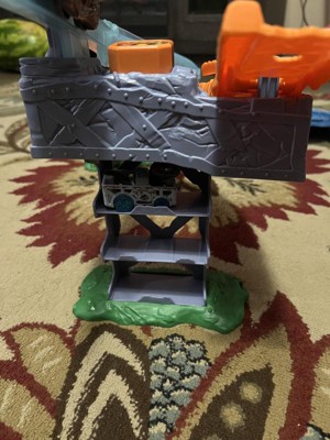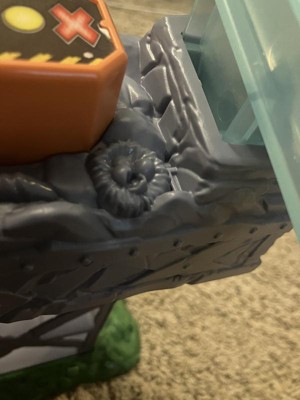 The dinosaur coming down gets stuck where the orange ramp meets the blue ramp. Pretty badly designed. Can’t return it since we already threw out the box. Pretty disappointed. Don’t buy it.