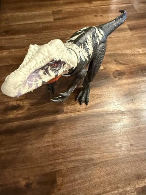 This Gigantic Thrashers Chilantalsaurus action figure inspired by Jurassic World Rebirth has 2 dramatic tail-activated attack motions! It's a Total Attack move the tail up and down for a ferocious head chomp and arm attack, then twist the tail for a side-to-side chomp! At 14 inches long, with authentic sculpting, color and texture, this posable large species dinosaur toy is ready for active battle play or a dramatic display. Scan the Tracking Code on the dinosaur's foot in the free Jurassic World Play App with a compatible smart device (Android or iOS, not included) to unlock a digital version of the dinosaur and play the fiercely fun game to race various vehicles on land, air and sea. Makes a great gift for dinosaur fans ages 4 years and up. Colors and decorations may vary.