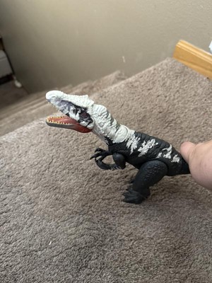[This review was collected as part of a promotion.] My son loves playing with this larger Chilantaisaurus from Jurassic World. It's mouth opens and closes when the tail is moved up and down. When the tail is twisted from side to side the head also tilts left and right. There is a code on the foot that can be scanned to play in the Jurassic World App. However, we haven't looked into that. All the legs are movable, and the back feet can be turned inward/outward, making it easier for it to stand without holding it up. The seam on the chest is separated and not lined up. Making the corner a bit sharp. I tryed to push it back together but couldn't
