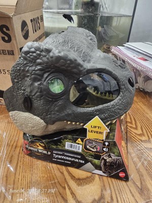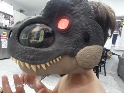 This Tyrannosaurus rex mask is sure to thrill any Jurassic World fan with its appearance straight out of Jurassic World Rebirth and 3 levels of Rage 'N Roar effects! With authentic movie design, this Tyrannosaurus rex mask is intimidating even in its 'resting' state with ferocious teeth, blinking eyes and soft growl sounds. The light-up eye effects increase with three levels of aggression and increasingly fierce growls as the jaw is opened! It's fierce, it's fiercer, watch OUT! This role play mask will light up any Jurassic World fan 6 years and older. Eye and mouth openings provide easy wearability and an adjustable strap provides a secure fit. Colors and decorations may vary.