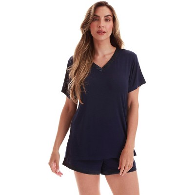 • HAVE SOME FUN: Make nighttime a bit more colorful with our solid color and printed ribbed pj t shirt and short sets. The earth tone PJs have a V neck on the top. The shorts have a self-trim inner waistband for a lovely finished look.