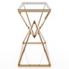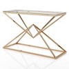 Friends and family are sure to be enraptured with the bold, sculptural design of this modern glass console table. It features a dramatic open base crafted in steel with a pair of open, intersecting pyramid frames that meet at their apexes to create an intriguing diamond center. The tabletop is glass, allowing the base to take center stage in an elegant entry or living room.