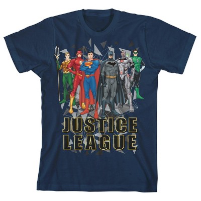 • GRAPHIC TEE: The superheroes Wonder Woman, Cyborg, Aquaman, The Flash, and Batman are surrounded by blue energy waves on this shirt. The Justice League shield appears above the heroes. Fans of the characters will love this tee.