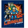 Celebrate the legendary team of superheroes with this Justice League Tee. The shirt features the characters Batman, Superman, The Flash, and The Green Lantern drawn in pixels in front of a flame background. White and red text on the bottom reads, "Justice League of America." The tee comes in a navy short sleeve crew neck. This shirt makes a great gift for young Justice League fans.