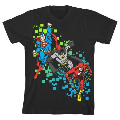 Justice League Superhero Trio and Logo Background Boy's Black T-shirt-XS
