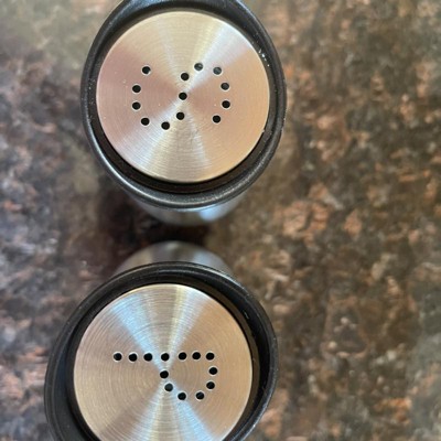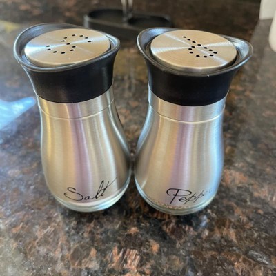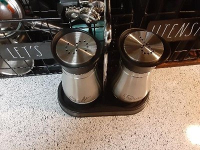[This review was collected as part of a promotion.] This is a very cute set. Love how the glass and stainless steel looks together in the black they're very easy to clean and use. Love that they're not heavy the quality of those product is very durable and they are beautifully put together and designed. Overall if you're looking for something to match your stainless steel theme in your kitchen I highly recommend these salt and pepper shakers with the caddy. As they are very beautiful elegant lightweight and overall just perfect to have.