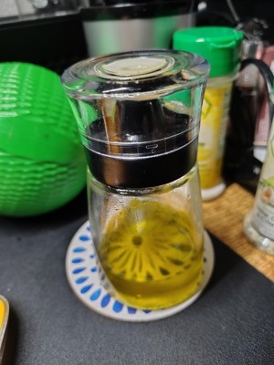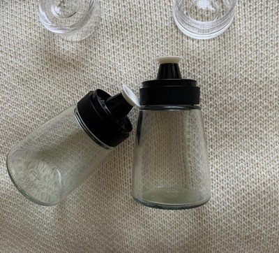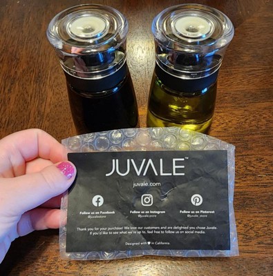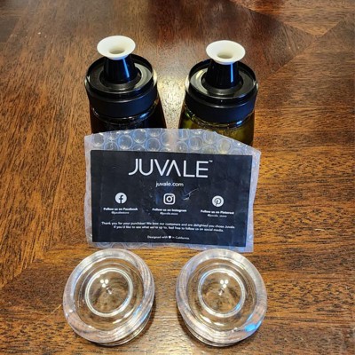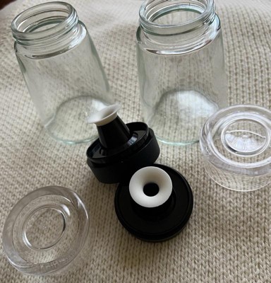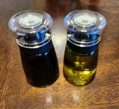 [This review was collected as part of a promotion.] These Juvale 5.5oz glass oil and vinegar dispensers are cute and functional. I appreciate that they are glass, good quality, and easy to clean. They're perfect sized to leave at the table for salad dressings, dipping bread, etc. The caps stay on snuggly to prevent spills. The pouring spouts are rubber and a bit bigger than I would prefer, but overall, I really like and recommend these!