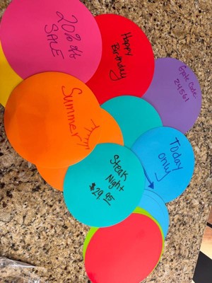 [This review was collected as part of a promotion.] These are great little dry erase stickers that you can use and reuse for just about anything. The back peels off easily so you can stick it to any surface. They are a nice variety of colors, you can easily read about any color dry erase marker on them. Very fun and versatile.