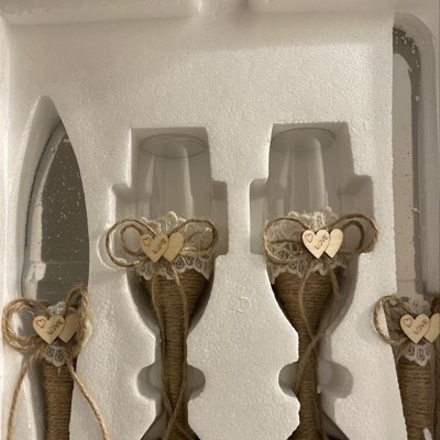Juvale 4 Piece Rustic-Style Wedding Cake Knife and Server Set with Champagne Glasses for Bride and Groom, Country Theme Wedding Supplies