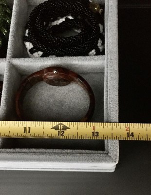- Dimensions: Our gray velvet jewelry tray measures 13.8 x 9.5 inches with a thickness of 1.2 inches; each grid measures 3 x 3 inches