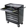 This is a black seven-drawer multi-purpose tool cart designed for efficient storage and easy mobility. Constructed from sturdy, durable materials, it offers strong load-bearing capacity and is suitable for various settings such as workshops, auto repair shops, and home garages.