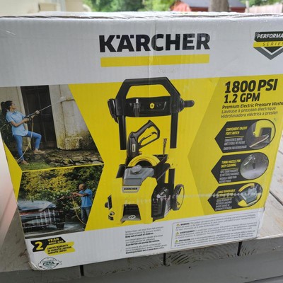 Kärcher's Performance Series K1800PS electric pressure washer was developed to offer high cleaning power and unparalleled ease of use. This electric pressure washer delivers 1800 PSI of TruPressure, ensuring you get a high level of cleaning power driven by a reliable universal motor. It includes convenience features such as a unique on/off foot switch, a handy storage bin, a large half gallon removable detergent tank and three spray nozzles (including a turbo nozzle for intense cleaning). Metal hose connections, a sturdy spray wand and an integrated black aluminum frame make this high pressure washer highly durable. With 8" never flat wheels, the machine is very easy to maneuver over even difficult terrain. Universal quick-connect nozzles and standard M22 hose connections simplify nozzle and accessory usage. Best of all, no tools are needed for assembly. You can set up and start using the K1800PS in five minutes or less! Backed by a two year bumper-to-bumper warranty with industry-leading Rapid Exchange Program, this compact pressure washer is perfect for tackling typical outdoor cleaning tasks such as cleaning small driveways, sidewalks, decks, windows, patio furniture, campers, bikes, boats, and many other recreational applications. Kärcher electric models of pressure cleaners offer solid cleaning ability that is high on value and big on performance.