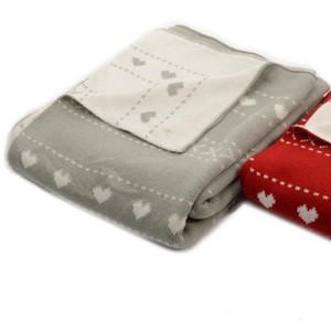 This knitted throw blanket features a light gray blanket that is decorated with a white heart pattern throughout the blanket