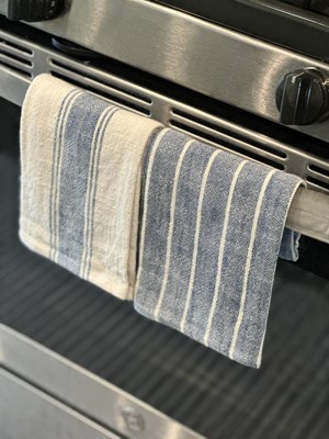 Set of Two (4) Kitchen Towels, made from 100% absorbent, pre-washed, slubbed cotton. These trendy tea towels are aesthetically pleasing and give your kitchen a modern farmhouse feel. Each towel measures 18 x 28 Inches, and feature a centered hanging loop, so you can hang them conveniently on any hook, and they won't drape to the ground like corner hanging loops on most kitchen towels. These towels feature a beautiful stripe pattern and natural linen-like look, making them perfect for the modern or classic kitchen. Their rustic, timeless look will make you feel like you are in the French countryside every time you step into your kitchen.
