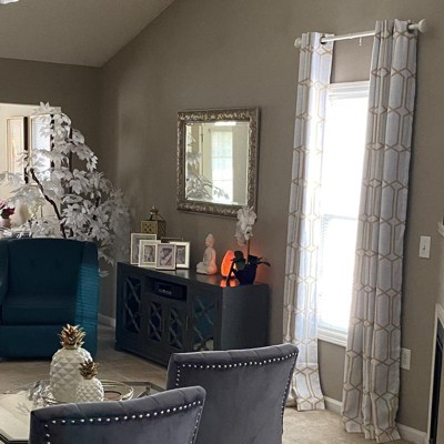 The Kaiden curtains feature an allover geometric trellis on a luxurious linen blend ground. This stylish window panel is lined to offer blackout benefits and an elegant drape. 1.65 brushed silver grommets are recommended with up to a 1 inch rod for maximum movement. Poly/Linen blend. Sold as a single panel. Easy care, machine washable.