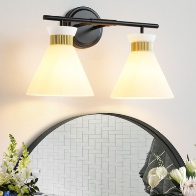 - Inspired by mid-century design, this light blends soft, milky glass with sleek metal arms and chic gold rings. It instantly elevates your bathroom into a curated retreat.