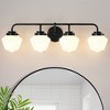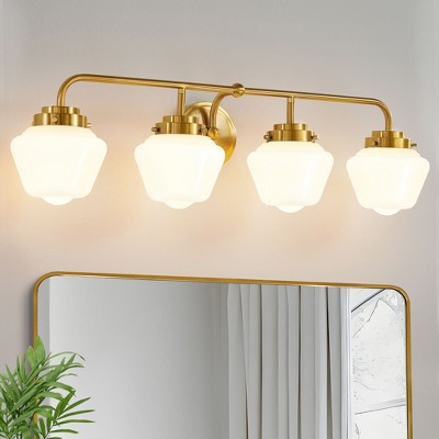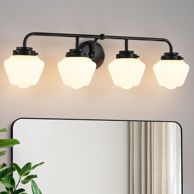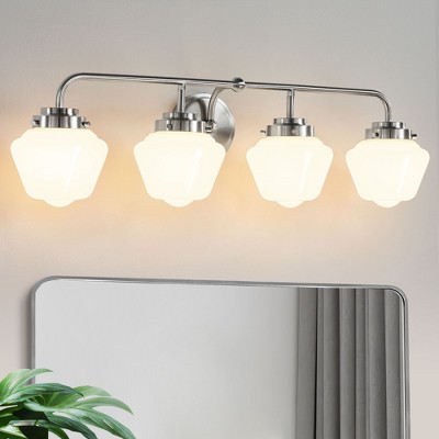 Brighten your bathroom with this 4-light vanity fixture, crafted from durable aluminum with a sleek modern silhouette. The white glass shades provide a soft, flattering glow that enhances any space, while the rust-resistant finish ensures lasting performance.