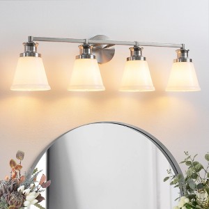 Transform your bathroom into a luxurious sanctuary with the KAISITE 4-Light Vanity Light. Its expansive, four-arm silhouette creates a grand, statement-making look, framing your mirror with four beautiful, hand-blown opal glass shades that cast a soft, flattering glow, turning your daily routine into a spa-like experience.