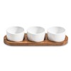Kalmar Home's White Ceramic Condiment Set on Acacia Wood base - seamlessly blends functionality with elegance.Made from solid acacia wood, known for its durability and distinct grain patterns, this 13" x 3.75" board is built to withstand the demands of daily use.Perfectly designed to hold condiments, sauces and toppings as well as candy, nuts and snacks - this multifunctional piece is a practical and stylish addition for any culinary presentation.The bowls are perfectly sized, measuring 3.75" diameter x 2" height, designed to hold a variety of culinary items and fit perfectly within the routed areas to avoid unnecessary movement or spillage.To ensure that food stays fresh and protected, each ceramic bowl is paired with an acacia wood lid.We recommend hand-washing with mild soap and warm water to maintain its beauty and integrity for years to come. To preserve the wood's natural luster, occasional oiling with food-grade mineral oil is recommended.