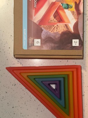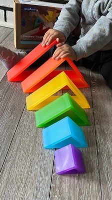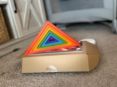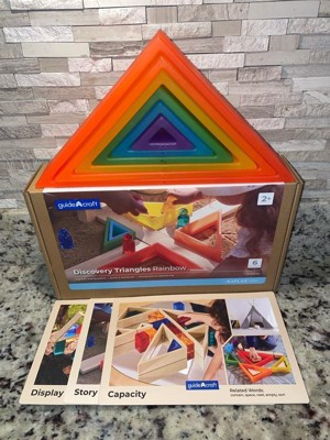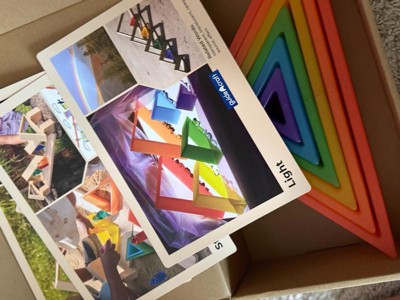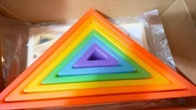 - Set includes 6 triangle shapes in nesting sizes and rainbow colors as well as double-sided concept cards