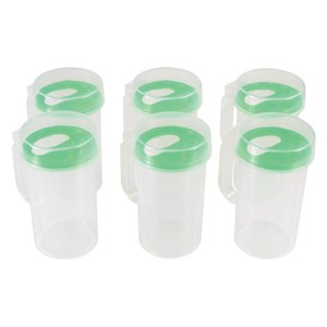 Pouring made easy during family style dining or during snack time. These easy-to-pour 16 ounce pitchers feature snap on lids, splash free spouts, removable covers, and are sized right for little hands. Help children develop the fine motor skills of pouring a glass. Each pitcher is dishwasher safe and measure 6 1/2"H. Includes set of 6.