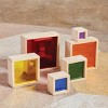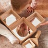 Reflections are fascinating to young children. The colorful, reflective inserts in the Nesting Pyramid Mirror Set will entice, engage and entertain young children as they explore and develop self-awareness. Encourage innate curiosities by using this set in conjunction with a light table, or using outside in sunlight. Rubberwood frames and shatter-resistant inserts make this set a durable addition to block play activities as well. One side features clear mirrors, while the other side has colorful mirrors.