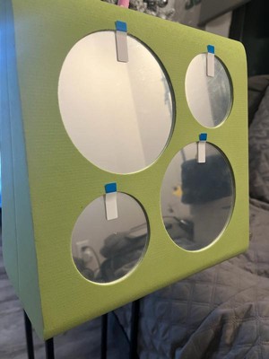 - Features a square mirror on one side, and a variety of circle shapes on the opposite side