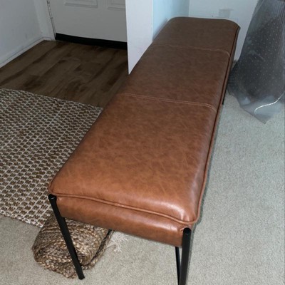 Cushion is firm, sturdy and soft to the touch. It can seat 3 people easily. I’m using this as an entryway bench. Installation was medium difficulty as one of the leg angles made it harder to screw in. Overall only took about 10 minutes for me to do it alone. The warm, tobacco distressed color matches the target leather pillow really well! It’s warmer than the pics show (lighting is bad right now)