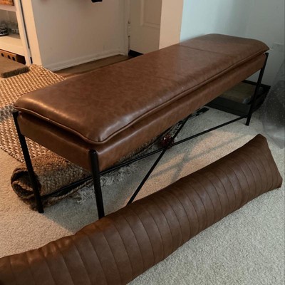 Introducing the Kara Cushioned X Bench, a stylish addition to any space. Crafted with a sleek black metal frame, this bench offers a striking contrast to its warm brown seat. Made with PU material, it provides a welcoming spot to relax. The modern design fits seamlessly into various settings, whether placed at the end of a bed or used as extra seating in the living room.