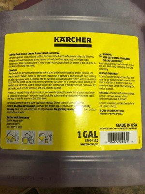 [This review was collected as part of a promotion.] The Karcher 1 Gal. Cleaner smells great and did a fantastic job removing dirt, algae, and mildew from my deck. It’s powerful, easy to use with a pressure washer, and one gallon goes a long way—up to 36 gallons. Great value, great results.