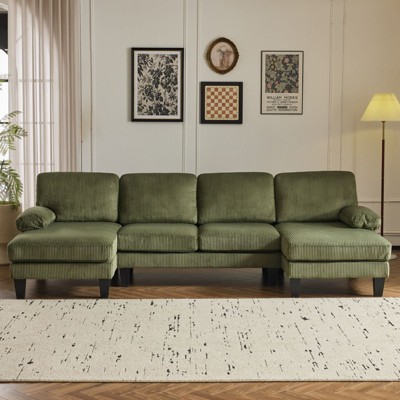 Karl Home |120 in. W Pillow Top Arm Double-layer Cushion Corduroy Sofa in White With Ottoman