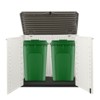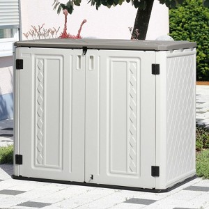 The Patio-Store Horizontal Shed provides accessible storage for your backyard, garden, or poolside. With its 34 cu. ft. storage capacity, this shed boasts a spacious interior that can hold up to two - 32Gal trash cans, or a wide array of patio accessories, pool equipment or garden tools. With its sloped threshold, even your push lawnmower can be easily rolled in or out for convenient weatherproofstorage.