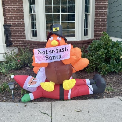 - Eye-catching Design: Transform your yard into a winter wonderland with this funny blow up decoration. This large decoration is perfect for creating a welcoming holiday atmosphere for guests and passersby alike. Featuring a cute Thanksgiving turkey sitting on Santa Claus and saying "Not so fast santa", this inflatable will be the star of your indoor or outdoor display and a fantastic photo backdrop for capturing holiday memories.