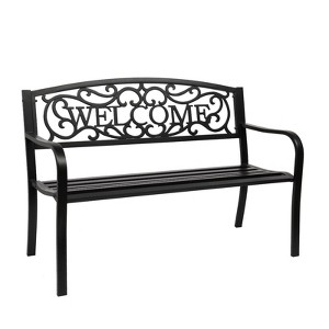 This beautifully designed powder coated bench will add elegance to your front or backyard, which will be a great addition to garden or make a completion for your path. This bench features powder-coat steel construction to deliver durability and light weight, and the antique finish adds an attractive look to your patio or deck. The stylish design on the backrest provides a stylish look, and the bench is easy to assemble. Beautifully designed powder coated bench will add elegance to your front or backyard, ideal for along a path, under a tree, among the flowers or in your favorite peaceful spot.