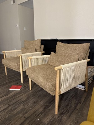 Elevate your indoor relaxation with this beautifully crafted accent chair, designed to combine natural elegance and modern comfort. The chair features a solid wood frame in a warm, natural wood finish, offering durability and a timeless aesthetic. Its unique handwoven rope armrests add a touch of artisanal charm while ensuring lasting strength.