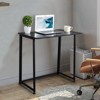 This desk features a simple and fashionable design, making it look elegant and attractive. With a sleek black finish and a sturdy metal frame, it fits well in various spaces like home offices or study areas. It offers a compact yet functional surface for your laptop and essentials, and its minimalist style adds a touch of modern charm to any room.