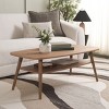 Uplift any corner with the modern charm and rustic appeal of our Karou coffee table. Our mid-century-inspired coffee table enlivens your space with its effortless style and warm elevating tone. Its rectangular tabletop is finished off with rounded edges to attain a soft and inviting look. Tapered legs complete the sleek and modern profile of the coffee table. It showcases the organic grains of wood in an oak finish. Our coffee table includes a lower shelf to provide ample space for both display and storage.